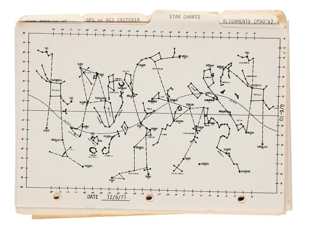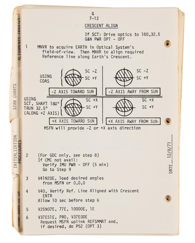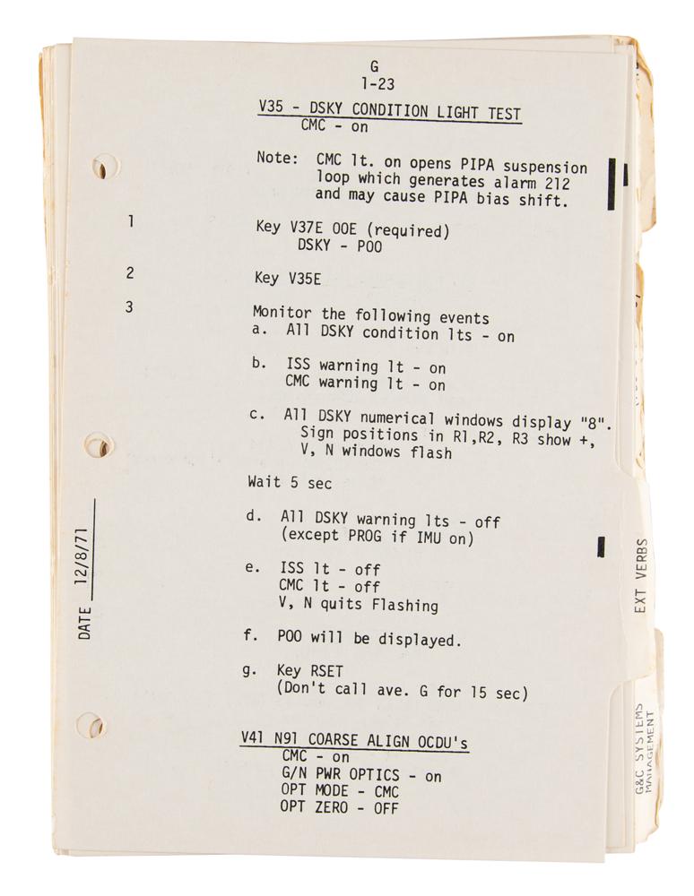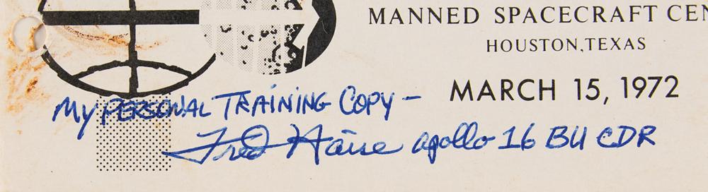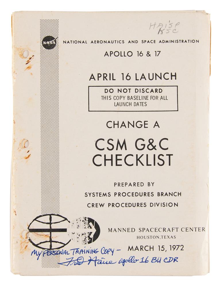 Fred Haise's training-used official unbound NASA checklist entitled "Apollo 16 & 17, April 16 Launch, Change A, CSM G&C Checklist," approximately 125 pages, 6 x 8, dated March 15, 1972, signed on the front cover in blue ballpoint, "My personal training copy—Fred Haise, Apollo 16 BU CDR." Prepared by the Manned Spacecraft Center's Systems Procedures Branch, the manual covers all aspects of the Command Module's Guidance and Control (G&C) systems. It provides a list of star codes used in celestial navigation, alarm codes, programming and procedural instructions, and steps for various flight maneuvers using the SPS and RCS thrusters. In fine condition, with wear and scattered staining to the covers.