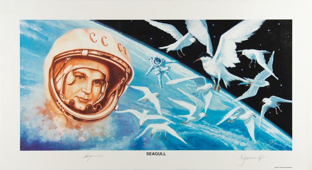 International edition color 32 x 17.75 print of an Alexei Leonov painting entitled 'Seagull,' depicting Valentina Tereshkova in space with numerous seagulls flying about, signed in the lower border in pencil by Leonov and Tereshkova. Rolled and in fine condition, with a couple trivial creases. Accompanied by a certificate of authenticity from Star Press Publications. This particular image not only commemorates Tereshkova's flight, but the 11 seagulls represent the number of American women that had been in space at the time the original was painted. 'Seagull' was Tereshkova's chosen call sign during her mission.