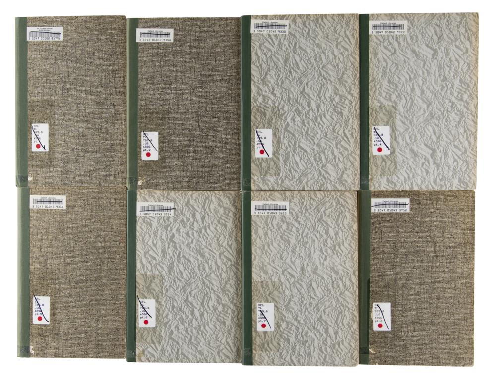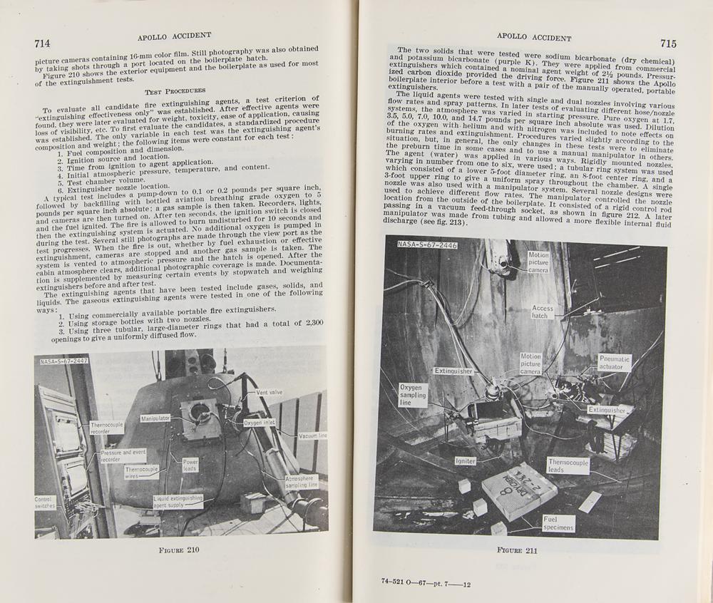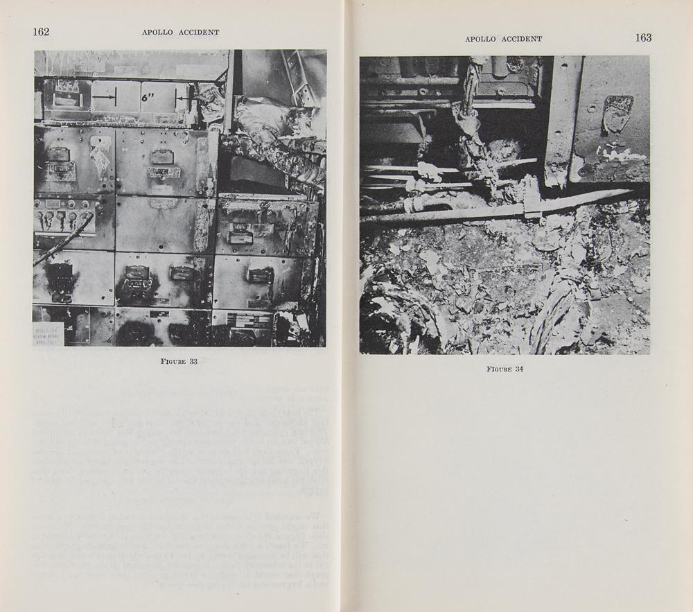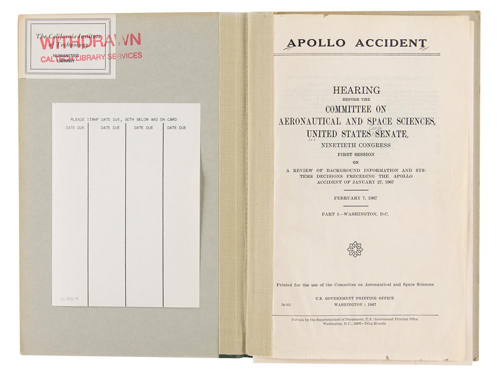 Official printings of the report entitled "Apollo Accident: Hearing before the Committee on Aeronautical and Space Sciences, United States Senate," Parts 1-8, published by the U.S. Government Printing Office in 1967-1968. These document the Congressional inquiry into the tragic Apollo 1 (AS-204) fire, and include many images, charts, and graphs presented as exhibits. The eight booklets are housed in simple library bindings, and marked as withdrawn from the California Institute of Technology Humanities Library; all bear several ex-library marks and labels. In very good to fine condition, with aforementioned ex-library markings throughout, and textblocks of Parts 1 and 5 detached from the bindings.