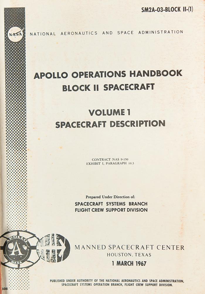 Official bracket-bound NASA manual entitled “Apollo Operations Handbook Block II Spacecraft, Volume 1 Spacecraft Description,” (Contract NAS 9-150, Exhibit I, Paragraph 10.3), prepared under the direction of the Spacecraft Systems Branch / Flight Crew Support Division. The manual, 9 x 11.5 x 2, dated March 1, 1967, is marked in felt tip on the spine textblock, “RLP,” and the front cover, “AOH, Block II, Vol. I.” The manual is comprised of three main sections—Spacecraft, Systems Data, and Controls and Displays—and includes two appendices for Symbols and Definitions and Alphabetical Index. In fine condition, with wear to the covers, and some rubbing to the title page. An early NASA manual related to the Block II CSM, the functional mothership for the historic Apollo Program moon-landings.