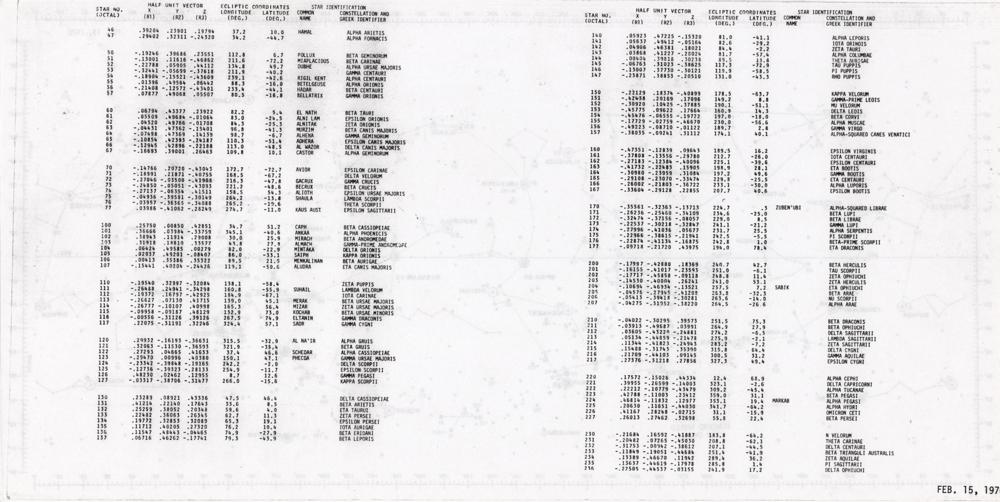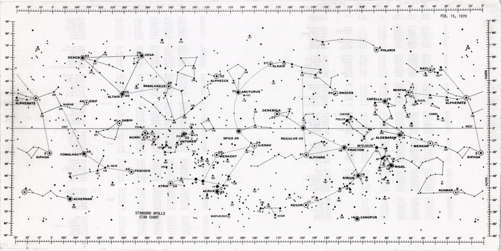 A “Standard Apollo Star Chart,” printed on both sides of a 16 x 8 paperstock sheet. The star chart includes the names of all Apollo navigation stars as well as trace lines that form the constellations used to locate and identify the stars. The chart is designed with the constellations aligned on the ecliptic, with specific stars used for Apollo navigation identified, named, and numbered with a two-digit numerical code ranging from 1 (Alpheratz) to 45 (Fomalhaut). The chart was used to identify and locate specific stars such that an onboard optical device, the Sextant, could be used to determine the orientation of the spacecraft relative to an onboard Inertial Measurement Unit (IMU); the onboard computer (the Apollo Guidance Computer) would then calculate the location of the craft in inertial space. The chart was also used for navigation during both translunar and transearth trajectories. The back of the chart was used to relate the star number with its common name, Greek name, unit vectors, and ecliptic coordinates. In fine condition.