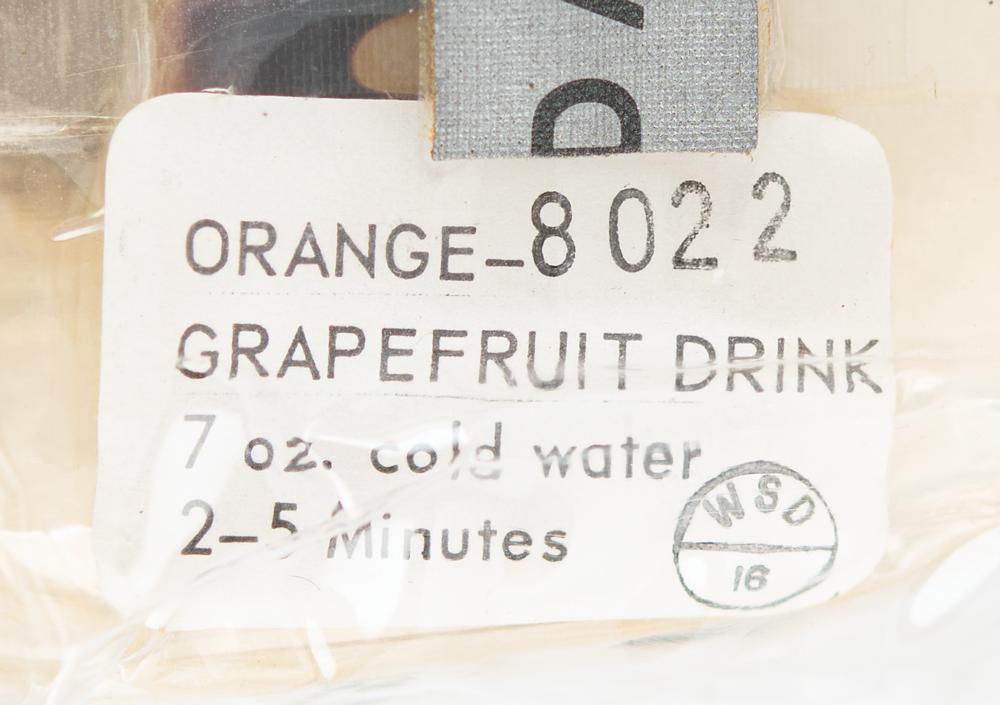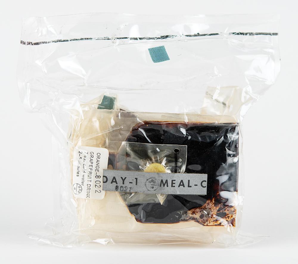 Scarce complete Apollo-era meal pack containing four packages of space food, a wet nap, and Dentyne-style gum. The food packages include beef and gravy, orange-grapefruit drink, chicken stew, and brownies. The package, approximately 8″ x 6″ x 3″, features an upper Velcro tab and an affixed label marked “Day-1 Meal-C, 8021.” In fine condition.