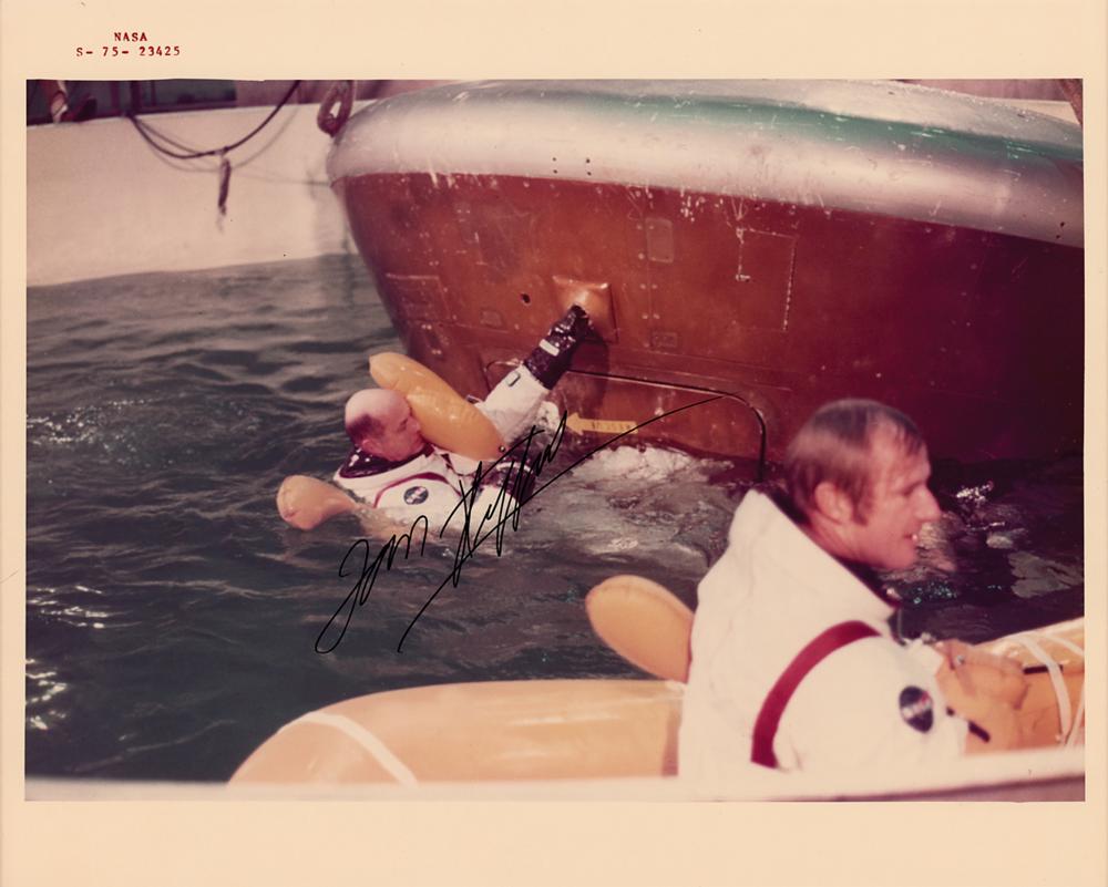 Official color semi-glossy 10 x 8 red-numbered NASA photo (S-75-23425) of astronauts Tom Stafford and Vance Brand during water egress training at the Johnson Space Center in preparation for the Apollo-Soyuz Test Project, signed in black felt tip by Stafford. Reverse bears NASA caption text and "This Paper Manufactured by Kodak" watermarks. In fine condition.