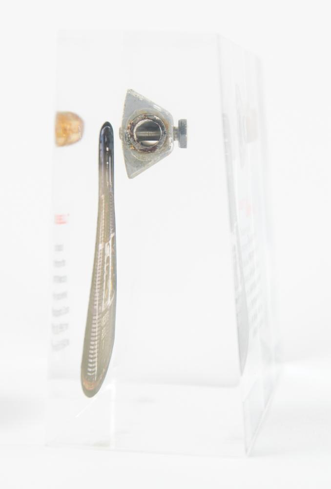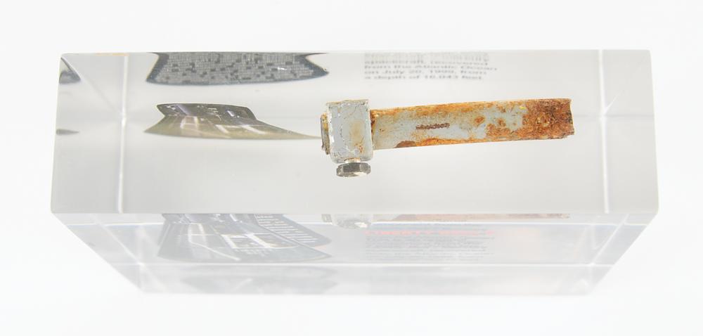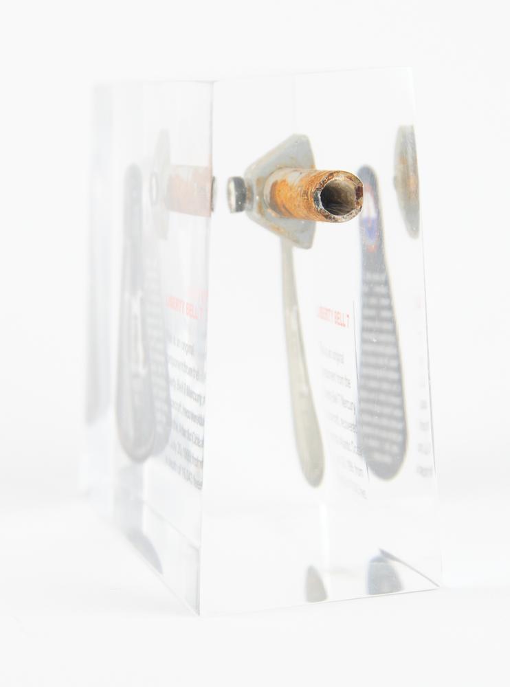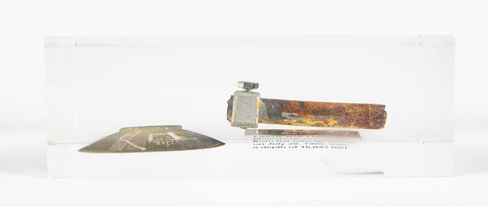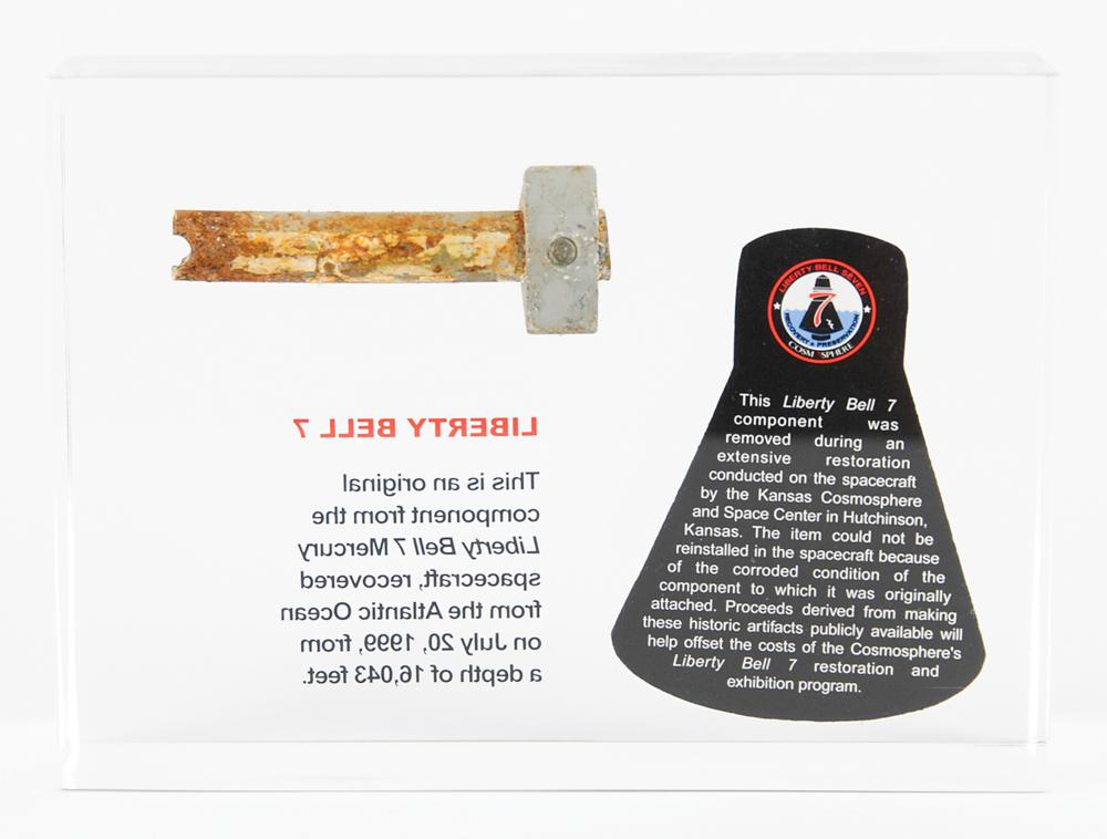 Impressive flown component from Gus Grissom's Mercury-Redstone 4 Liberty Bell 7 spacecraft, recovered from the Atlantic Ocean on July 20, 1999. The unusually large fragment of bolt-shaped tubing with inset screw measures approximately 3" x 1.25" x 1" and is presented inside a 7" x 5" x 2.5" Lucite display with an image of the spacecraft and printed information about the recovery; reverse of capsule image reads: "This Liberty Bell 7 component was removed during an extensive restoration conducted on the spacecraft by the Kansas Cosmosphere and Space Center in Hutchinson, Kansas. The item could not be reinstalled in the spacecraft because of the corroded condition of the component to which it was originally attached." In fine condition. Accompanied by a certificate of authenticity from the Cosmosphere.