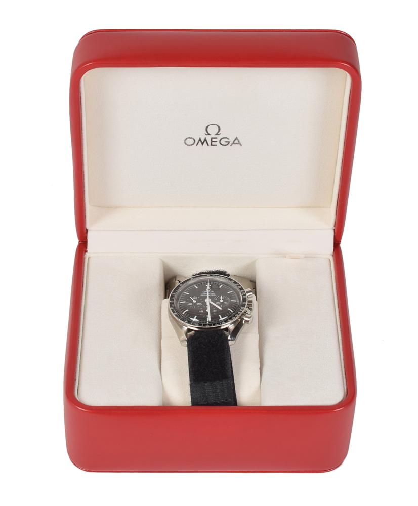 Record-setting cosmonaut Gennady Padalka's flown Omega Speedmaster Professional wristwatch, serial number 77754951, used on the International Space Station during Expedition 31/32 in 2012. The iconic timepiece is a black-faced, stainless steel chronograph, manual wind wristwatch with a Plexiglass crystal, solid case back, anti-vibration and anti-magnetic dust cover, black tachymeter bezel and sub-dials, without date or day complications, powered by a caliber 861-based movement. Engraved on the case back is "Flight-Qualified by NASA For All Manned Space Missions / The First Watch Worn on the Moon." The watch is on a black Velcro wristband, but includes the original metal bracelet issued with it. Also includes the original Omega red leather box, operating manual, and white cardboard box, which has a "Gennady Ivanovich Padalka" label affixed on the cover. In fine condition, with some light scuffing to the crystal. Originally sold by RR Auction in 2017, this watch was subsequently serviced by Omega (nothing cosmetic done, only lube, etc.), and includes a leather Omega band purchased later.