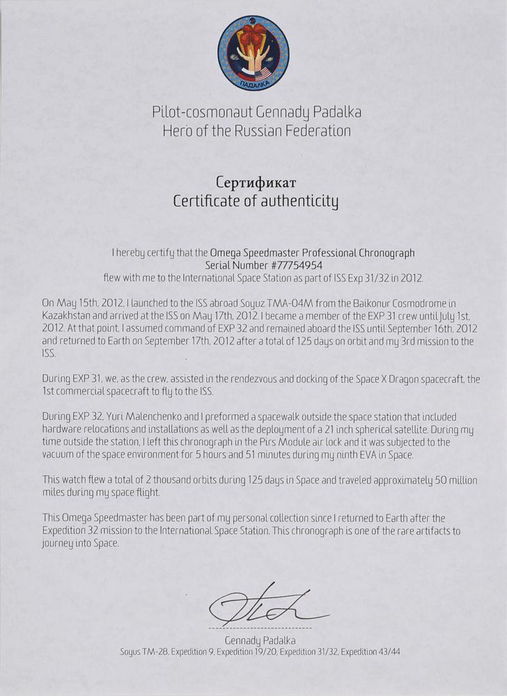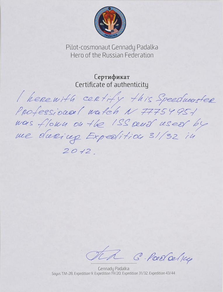 Accompanied by two letters of authenticity signed by Padalka, one typed and one handwritten; the handwritten letter reads, in part: "I herewith certify this Speedmaster Professional watch?was flown on the ISS and used by me during Expedition 31/32 in 2012." The typed letter, in part: "On May 15th, 2012, I launched to the ISS aboard Soyuz TMA-04M from the Baikonur Cosmodrome in Kazakhstan and arrived at the ISS on May 17th, 2012. I?returned to Earth on September 17th, 2012 after a total of 125 days on orbit and my 3rd mission to the ISS?During EXP 32, Yuri Malenchenko and I performed a spacewalk outside the space station?During my time outside the station, I left this chronograph in the Pirs Module air lock and it was subjected to the vacuum of the space environment for 5 hours and 51 minutes during my ninth EVA in Space. This watch flew a total of 2 thousand orbits during 125 days in Space and traveled approximately 50 million miles during my space flight. This Omega Speedmaster has been part of my personal collection since I returned to Earth after the Expedition 32 mission to the International Space Station. This chronograph is one of the rare artifacts to journey into Space." Also includes images of Padalka wearing the watch in space and signing the letters of authenticity.