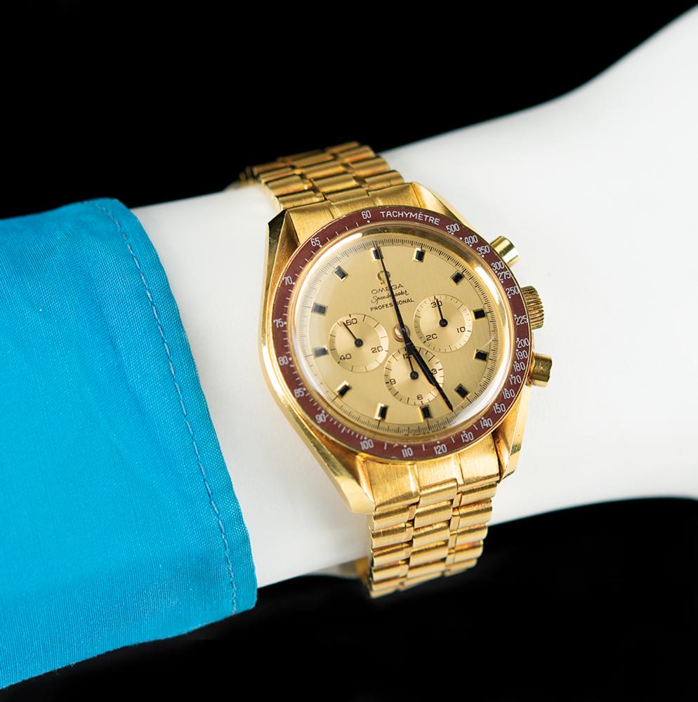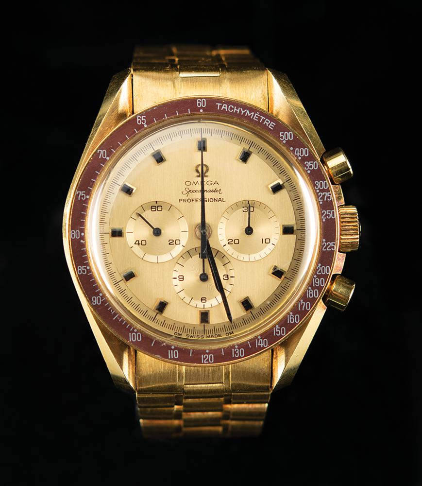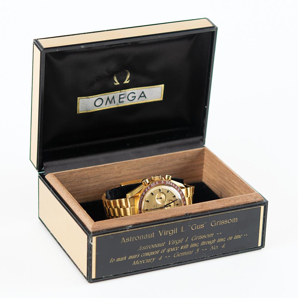 Extraordinary 18K solid yellow gold Omega Speedmaster Professional BA 145.022 watch presented to the family of the late Gus Grissom at a special gala dinner on November 25, 1969, at the Hotel Warwick in Houston. Omega initially created 26 of these gold commemorative watches—known as the ‘Tribute to Astronauts’ watch—to present to NASA astronauts alive and deceased, with the case back of each watch specially engraved with a quote, the name and missions of the astronaut, and a unique number relative to when the astronaut flew into space. This watch’s case back, issued as “No. 4,” is encircled, “Astronaut Virgil I. Grissom, Mercury 4 - Gemini 3.” The special central quote reads: “To mark man’s conquest of space with time, through time, on time.”