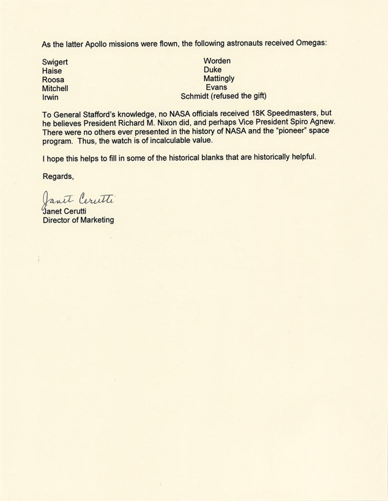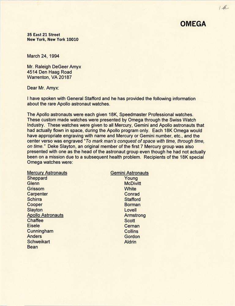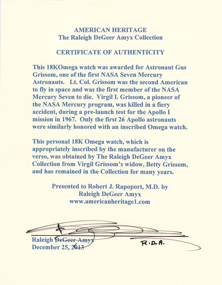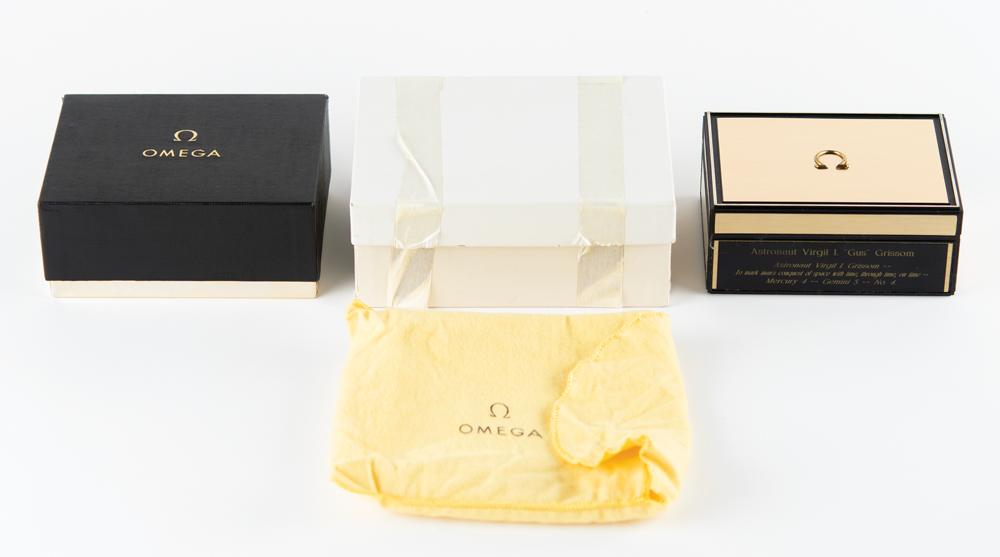Accompanied by a letter of provenance from noted collector Raleigh DeGeer Amyx, noting that he acquired the watch from Grissom's widow, Betty Grissom. Additionally includes a 1994 letter from Omega to Amyx, offering some history of the elusive 18K gold Speedmaster Pro astronaut watches and describing this chronograph as "of incalculable value."