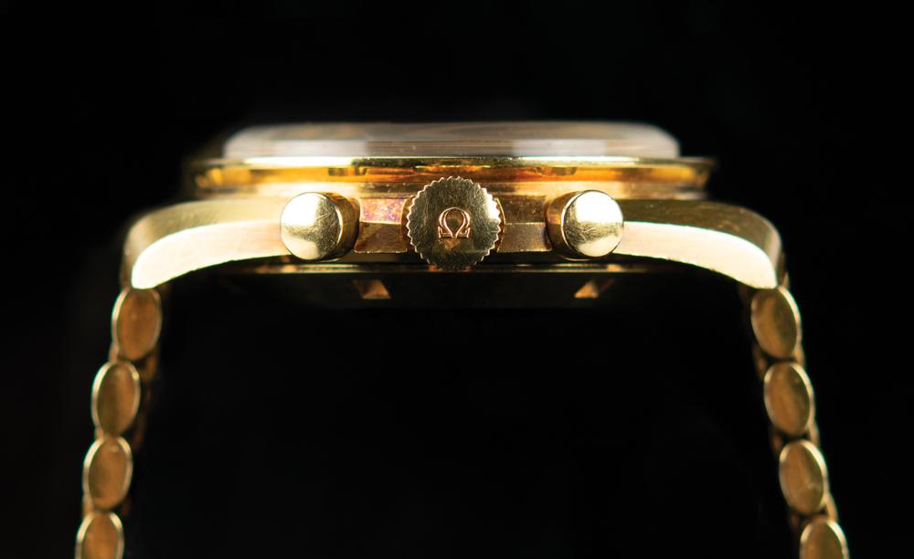 The first gold Speedmaster that Omega created, the watch features an 18K gold case with the same design cues and dimensions as the regular steel Speedmaster Professional. The gold bezel has a burgundy red aluminum inlay, with the famous ‘dot over ninety,’ and a special solid gold dial, indicated by the “OM” next to “Swiss Made,” which means ‘Or Massif’ or ‘solid gold.’ The hour markers are made of onyx, have two facets each, and are set in gold frames. The hands are black with gold centers and give wonderful contrast to the solid gold dial. The gold bracelet (1116/575) features hollow links and a small 14mm gold clasp with striping decoration. Inside the 18k gold 42mm case ticks the Lemania-based copper-colored chronograph caliber 861 with a steel brake; this caliber 861 has a ticking speed of 21,600vph and uses 17 jewels. Includes its original hinged Omega case and cardboard box (with "Virgil I. Grissom" on a typed label affixed to the bottom, evidently applied for distribution at the 'Tribute for Astronauts' dinner), as well as felt Omega bag; an engraved identification plaque was later added to the front of the case. The watch received official Omega authorized service in 2018 (nothing cosmetic done, only lube, etc.) and is in fine functional condition; cosmetically, the watch exhibits very minimal wear—it is a superior example, with just a few minor scratches.