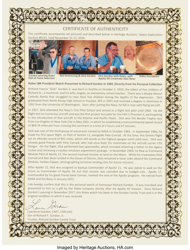 Accompanied by a letter of provenance from Gordon's son, Lawrence Gordon, on behalf of the Richard Gordon Family Trust, which auctioned the watch in November 2020. In part: "I do hereby confirm that this is the personal watch of Astronaut Richard Gordon. It was inscribed and presented to him as a gift by the Rolex company shortly after his Apollo XII mission." This was evidently Gordon's favorite watch, as he is frequently seen wearing it in photographs taken over the years—among these are images of him at his 1993 induction into the United States Astronaut Hall of Fame and at a Spacefest function, included with the watch.