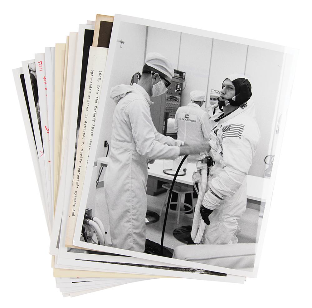 Scarce collection of 25 early original ‘working media’ glossy NASA photos and a group of nine first generation 70mm Hasselblad film transparencies and negative strips, all of which were used by Aviation Week magazine in 1968 to document the historic Apollo 8 mission. The NASA photos, each approximately 8 x 10 or 10 x 8, contain images of the Apollo 8 crew (pre-, mid-, and post-flight), the Saturn launch, tracking stations, equipment, egress training, the Anders family, mission control (with Neil Armstrong, Buzz Aldrin, Harrison Schmitt, and Deke Slayton), and outer space views of the Earth and the moon. A total of 17 photos feature either NASA caption text or “A Kodak Paper” watermarks to the reverse, seven include loose caption sheets, and several bear editorial notes in ink and grease pencil to either side. The negatives and transparencies, which range in size from 2.75 x 2.5 to 10 x 2.75, contain a total of 14 images of the lunar terrain, the Apollo 8 crew, the Saturn rocket and launch, and the Earth’s surface, some of which also bear editorial notations. In overall fine condition. Founded in 1916, Aviation Week magazine was later changed to Aviation Week & Space Technology, which is now in print and online as one of the world’s flagship publications of weekly aviation and space news. A rare collection of ‘working media’ photos and original film clips, some containing seldom-seen images from the first mission to orbit the moon.