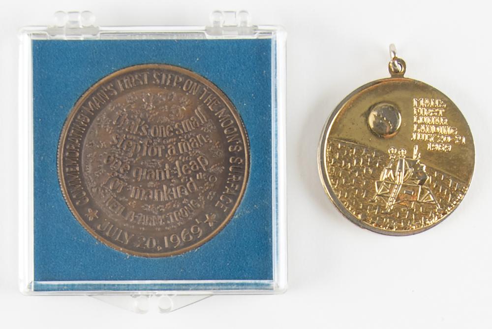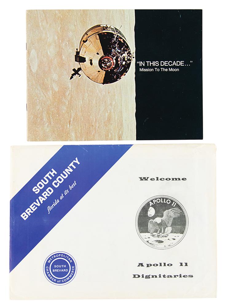 The collection also includes: an Apollo 11 launch pass, number ‘3295’; an Apollo 11 launch invitation; a NASA MSC MCC-Houston Viewing Room badge for the Apollo 11 moon landing, issued to “Mrs. C. Trude”; an Apollo 11 Birdwatcher eyewitness launch card, numbered ‘01130,’ issued to “Alfred S. Trude, Jr.”; an embroidered 3″ Apollo 11 ‘Bird Watcher’ patch; a bronze-tone 1.5″ commemorative medallion; a gold-tone 1.25″ commemorative pendant; and a “Welcome Apollo 11 Dignitarues” package issued by South Brevard County, which contains two NASA lithographs of the crew in their white space suits, two unissued “Apollo 11 Observer” certificates, a greetings letter from the South Brevard chamber of commerce, a map of ‘Apollo 11 Guest Centers,’ and a NASA booklet entitled ‘In This Decade?’ Mission to the Moon. In overall fine condition, with some light wear, and a crease to the ‘Viewing Room’ badge.