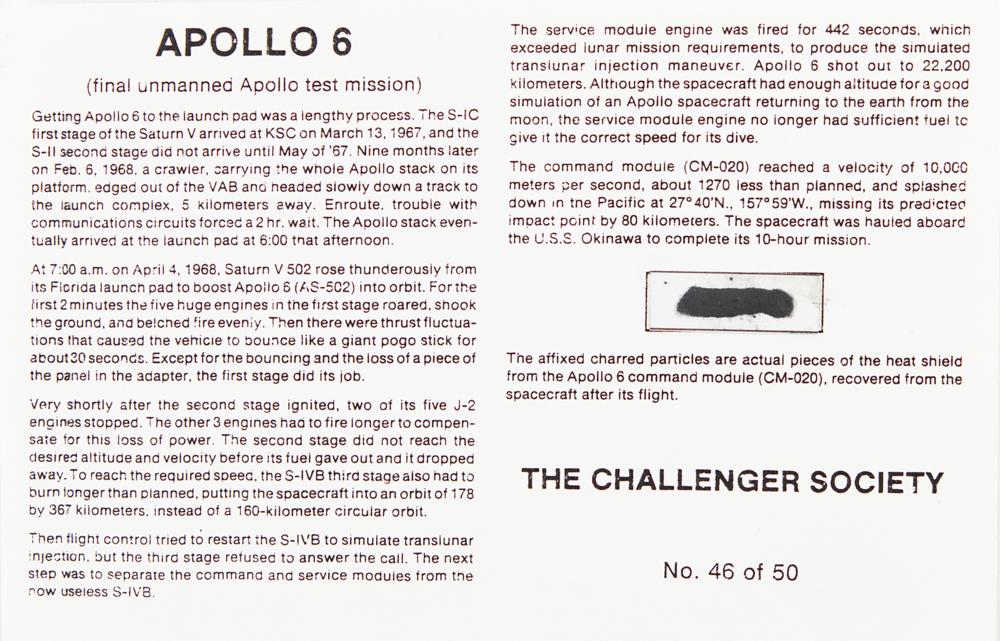 Limited edition 8.5″ x 5.5″ presentation sheet containing charred command module heat shield fragments, 1″ x .25″, attested to as being flown as part of the Apollo 6 mission, numbered 46/50, as prepared by The Challenger Society. Includes two original glossy NASA photos related to the Apollo 6 mission. In fine condition.