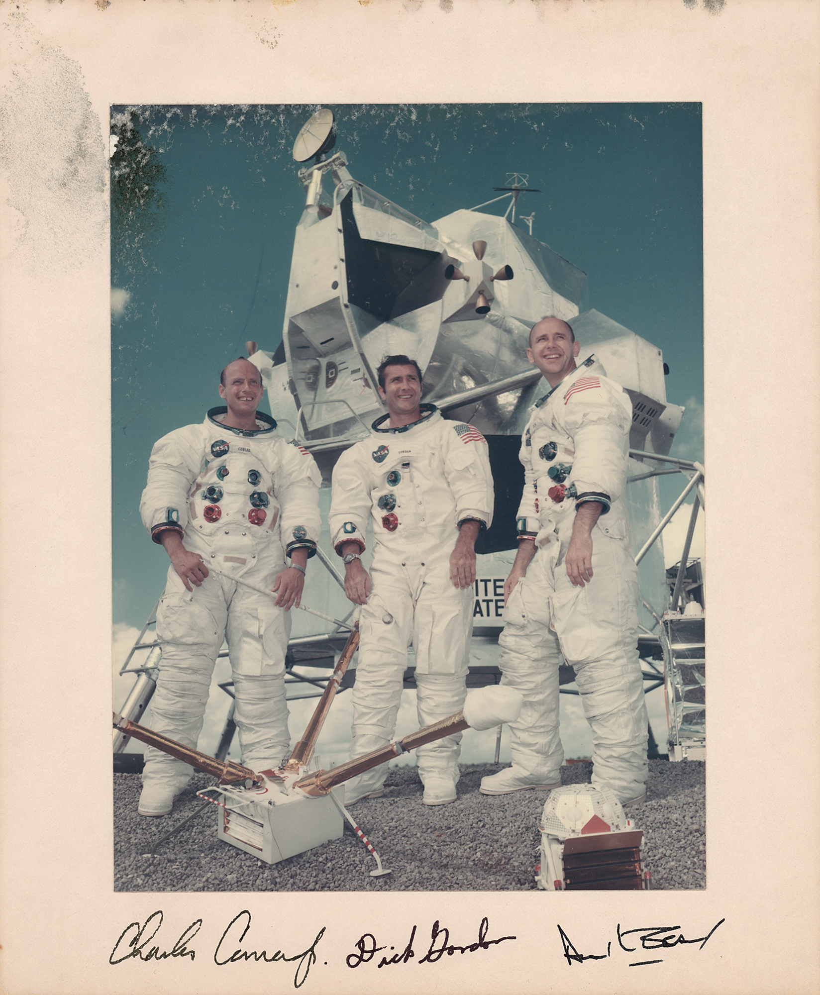 From the personal collection of Apollo 15 moonwalker Dave Scott?an official color glossy 7.25 x 9.5 NASA photo of the Apollo 12 crew posing outdoors in their white space suits with the lunar module, affixed to its original 10 x 12 cardstock mount, which is signed in black felt tip, ?Charles Conrad, Jr.,? ?Dick Gordon,? and ?Alan L. Bean.? The reverse of the mount is numbered "69-38852.? In very good to fine condition, with some dampstaining to the upper border areas, also affecting the top of the image.