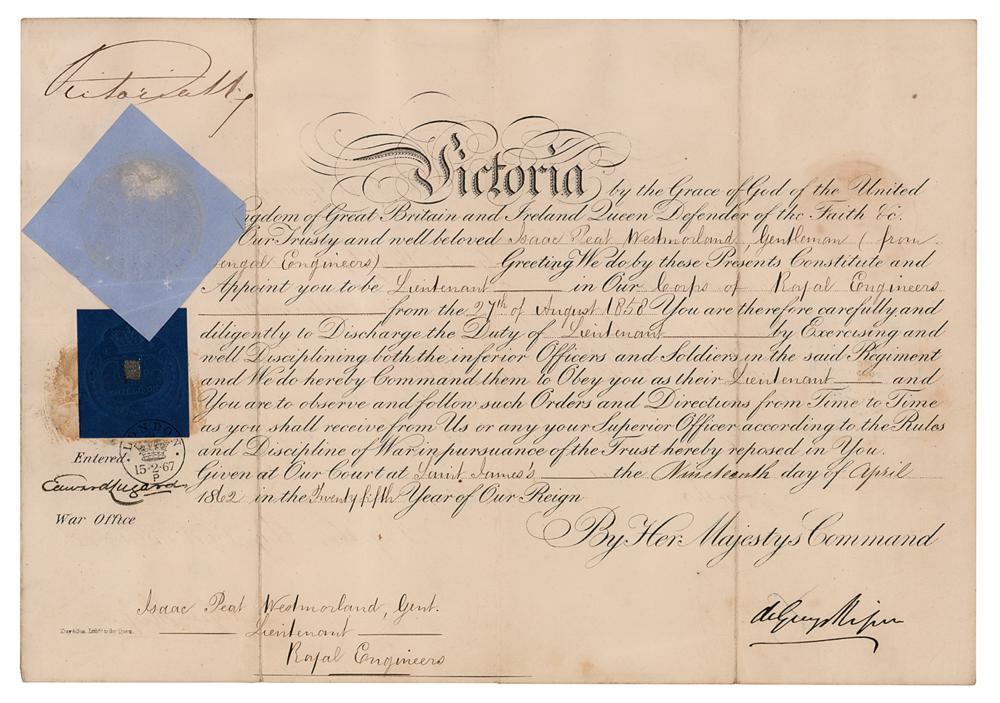 Partly-printed DS, signed “Victoria R.,” one page, 13.75 x 9.5, April 19, 1862. The Queen appoints Isaac Peat Westmoreland "(from Bengal Engineers)?to be Lieutenant in Our Corps of Royal Engineers." Signed neatly in the upper left corner by Queen Victoria, and countersigned below by George Robinson, 1st Marquess of Ripon. The light blue paper seal affixed below the queen's signature remains intact. In fine condition, with vertical folds.