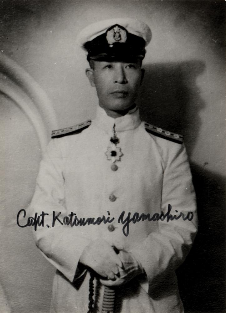 Japanese naval officer who commanded the 11th Flotilla (1900-1986) and who was Senior Officer on board the destroyer Amagiri on the night of the collision with John F. Kennedy's PT-109. Glossy 3.5 x 4.75 photo of the Amagiri commander in his Imperial Japanese Navy uniform, signed in black felt tip, "Capt. Katsumori Yamashiro." In fine condition.