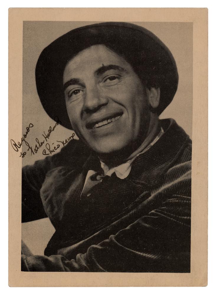 Vintage paperstock 5 x 7 photo of Chico Marx wearing a hat in a pleasant smiling pose, signed and inscribed in fountain pen, "Regards to Father Holland, Chico Marx." In very fine condition.