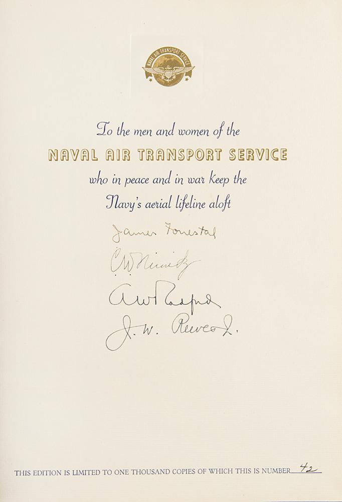 Signed book: Operation Lifeline: History and Development of the Naval Air Transport Service. Limited edition, numbered 42/1000. Chicago: Ziff Davis Publishing, 1947. Hardcover, 9.25 x 12.25, 171 pages. Signed on the colophon in black ink, "C. W. Nimitz." Also signed by James Forrestal, Arthur W. Radford, and John W. Reeves, Jr. In fine condition.