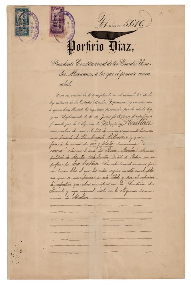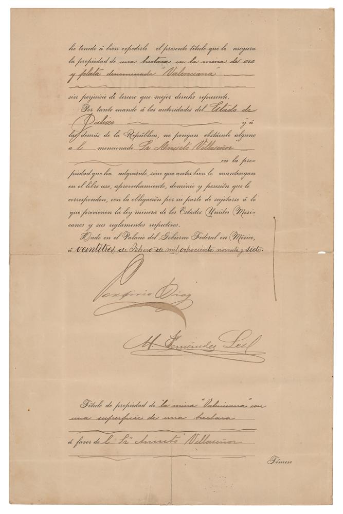 Partly-printed DS in Spanish, four pages on two adjoining sheets, February 23, 1897. Official document regarding the property title of the 'Valenciana' mine with an area of one hectare, in favor of Mr. Aniseto Villasenor. Signed prominently on the second page in ink by Porfirio Diaz as the president of Mexico. In very good to fine condition, with old tape reinforcing splitting along the hinge and the intersecting folds.