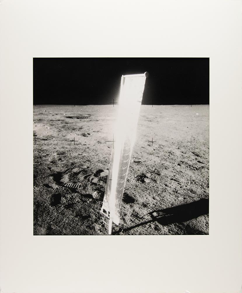 Large, high-quality 16 x 20 silver gelatin photograph of the Solar Wind Composition Experiment deployed on the moon by the Apollo 11 astronauts, matted to an overall size of 19 x 23 (with mat opening of 14 x 14). In very fine condition, with dings to the edges of the mat.