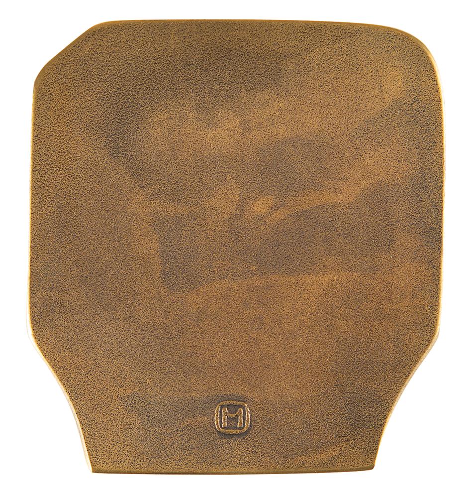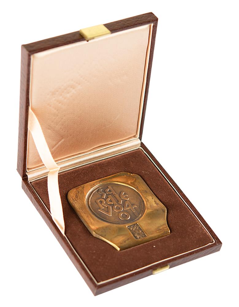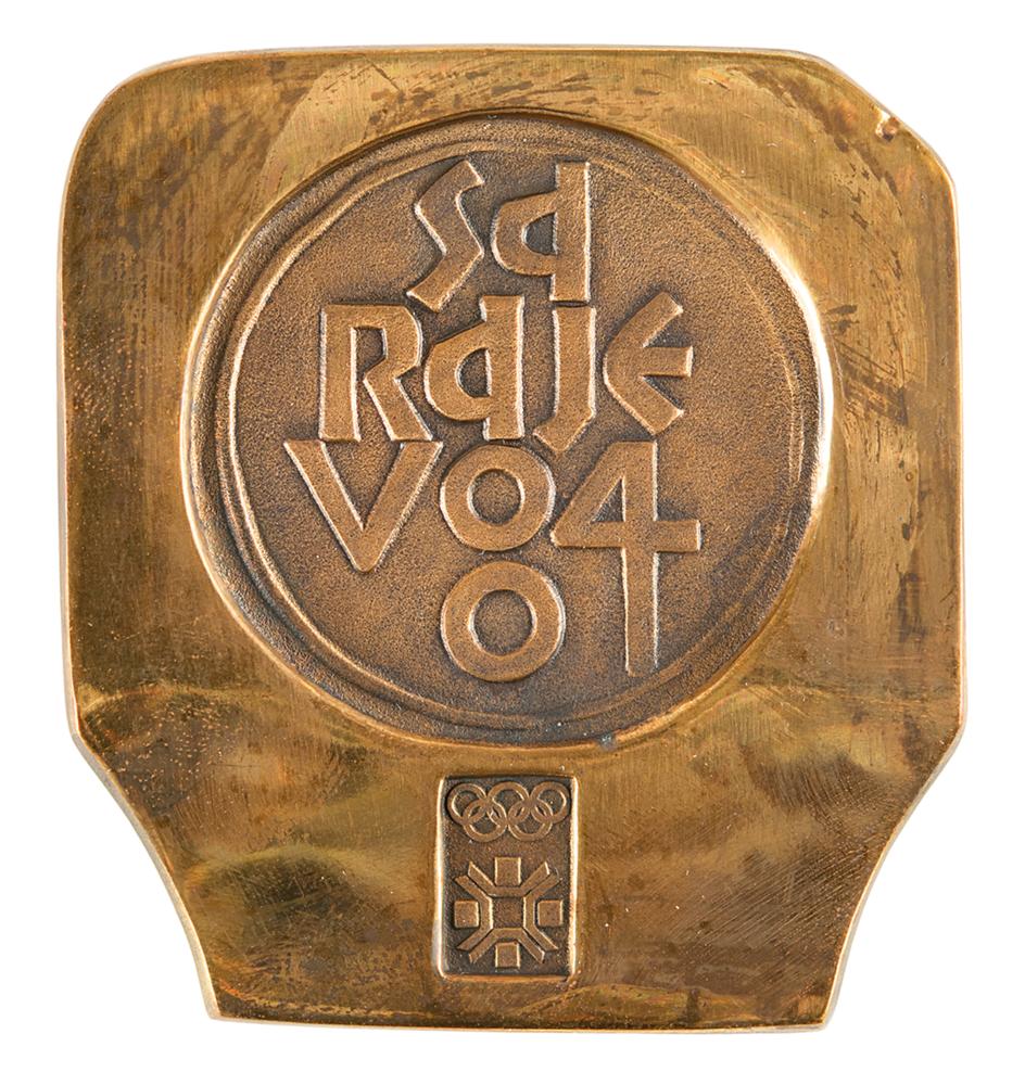 Participation medal issued for the Sarajevo 1984 Winter Olympics. Bronze, 60 mm x 65 mm, 129 gm, designed by Nebojsa Mitric. The front bears stylized raised text within a circle, “Sarajevo 84,” above the Olympic rings and logo; the reverse is plain with the monogram of the designer. Includes the original leather presentation case with its orange paper sleeve. These smaller-sized participation medals were bestowed to athletes and officials, while the large or medium examples were presented to dignitaries and officials, all of which have become increasingly sought-after by collectors.
