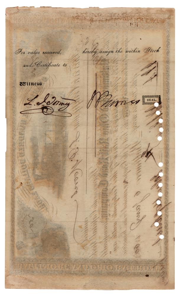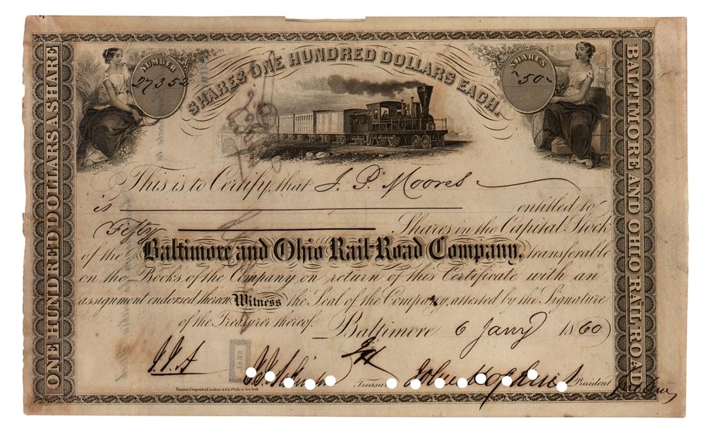 American entrepreneur, abolitionist and philanthropist (1795-1873) whose legacy lives on in numerous foundations and institutions, such as Johns Hopkins Hospital and Johns Hopkins University. Partly-printed DS, one page, 10 x 6, January 6, 1860. Stock certificate for 50 shares in the Baltimore and Ohio Rail-Road Company issued to J. P. Moores, signed at the conclusion by Hopkins as the company's president. In fine condition, with scattered toning, and cancellation holes touching the signature.