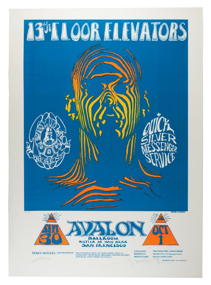 High-quality color limited edition 27 x 37.5 artist's proof lithograph featuring the Family Dog (FD 28) artwork for the 13th Floor Elevators and Quicksilver Messenger Service at the Avalon Ballroom on September 30-October 1, 1966, numbered AP15/50, signed in the lower border in pencil by artists Stanley Mouse and Alton Kelley. The iconic 'Zebra Man' image was appropriated from a 1954 Life Magazine cover. Printed on fine art paper, this officially licensed, hand-pulled lithograph was produced in 2008 in a collaboration between S2 Art Group and Rhino Entertainment. Rolled and in fine condition.