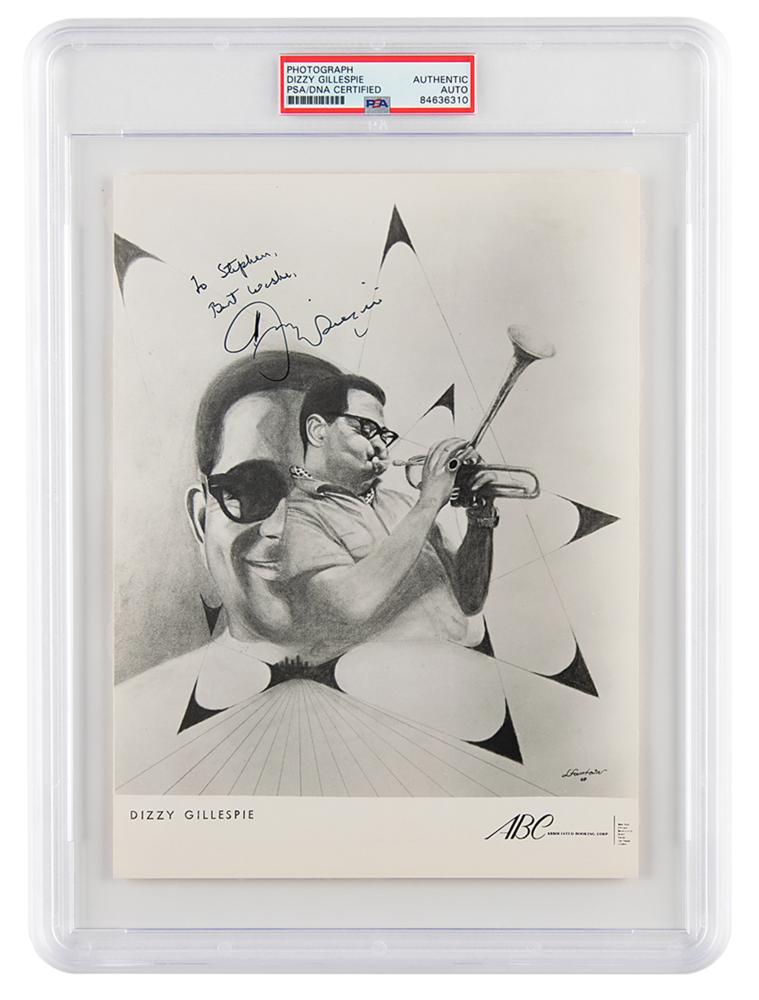 Glossy 7.25 x 9.75 Associated Booking Corp. promo photo of an illustration of the great jazz trumpeter, signed and inscribed in black felt tip, "To Stephen, Best Wishes, Dizzy Gillespie.” In fine condition. Encapsulated in a PSA/DNA authentication holder.