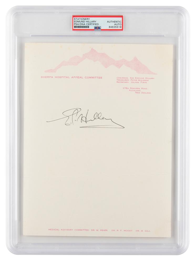 Ballpoint signature, "E. P. Hillary,” on an appealing off-white 7.75 x 10.25 sheet of Sherpa Hospital Appeal Committee letterhead. In fine condition. Encapsulated in a PSA/DNA authentication holder.