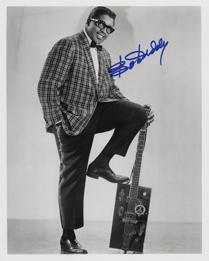 Glossy 8 x 10 photo of Bo Diddley posing with his trademark rectangular 'cigar box' guitar, signed in blue felt tip. In fine condition. Accompanied by a full letter of authenticity from REAL.