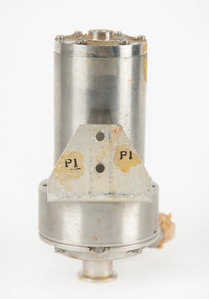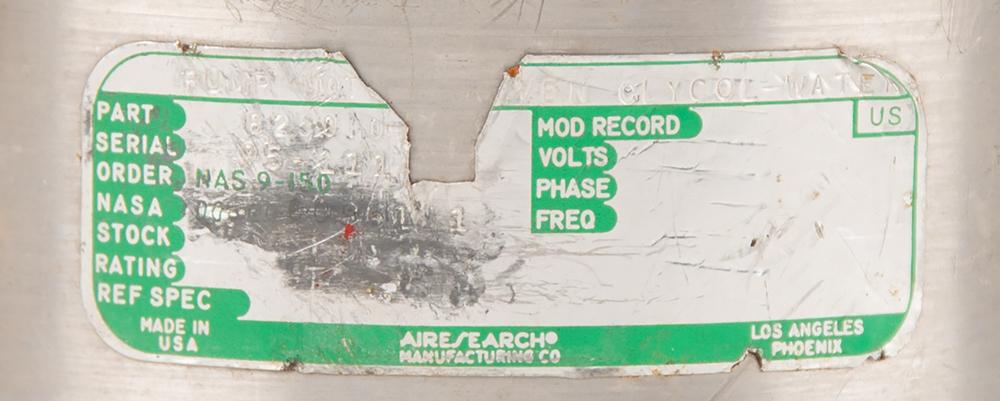 Apollo Command Module Environmental Control System (ECS) Coolant Pump, measuring 8.25″ x 5″ x 4.75″ and weighing 13 lbs, featuring a pair of Airesearch Manufacturing parts labels for “Motor AC,” with NASA number “004000055111,” and “Pump Motor…Glycol-Water”; both labels bear extensive scratching, rendering them nearly indecipherable. In fine condition, with scattered scuffs. The ECS Coolant Pump was used to circulate a special coolant, typically a mixture of water and ethylene glycol, through the spacecraft's environmental control system. This coolant helped in transferring heat away from various components and systems within the spacecraft, preventing them from overheating. The Coolant Pump played a crucial role in maintaining a stable and comfortable environment inside the spacecraft, which was essential for the astronauts' well-being during their missions, especially during the critical phases of launch, re-entry, and while in space. Proper temperature and humidity control were crucial to ensure the functionality of onboard systems and the health of the crew.