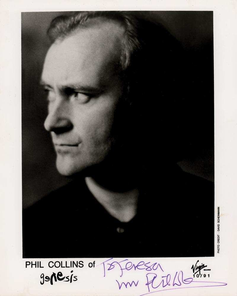 Satin-finish 8 x 10 Virgin Records publicity photo showing “Phil Collins of Genesis,” signed and inscribed in the lower border in purple felt tip, “To Teresa, luv Phil Collins.” The consignor notes that the signature dates to the circa 1980s. In fine condition, with very faint haloing to the handwriting. Accompanied by a certificate of authenticity from Tracks.