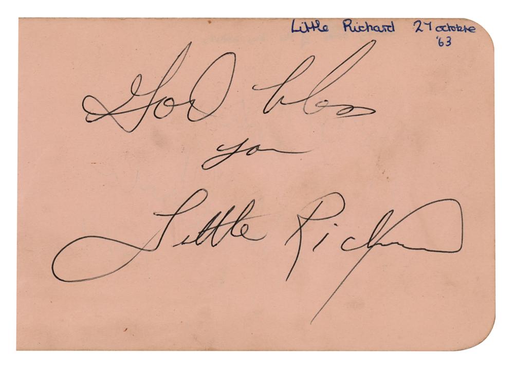 Vintage ballpoint signature, “God bless you, Little Richard,” on a peach-colored 4 x 5.75 album page. The consignor notes that the autograph was obtained at the Gaumont Cinema, Salisbury, England, when Little Richard was performing there with the Rolling Stones, Bo Diddley, and the Everly Brothers. In fine condition, with scattered faint soiling. Accompanied by a certificate of authenticity from Tracks.