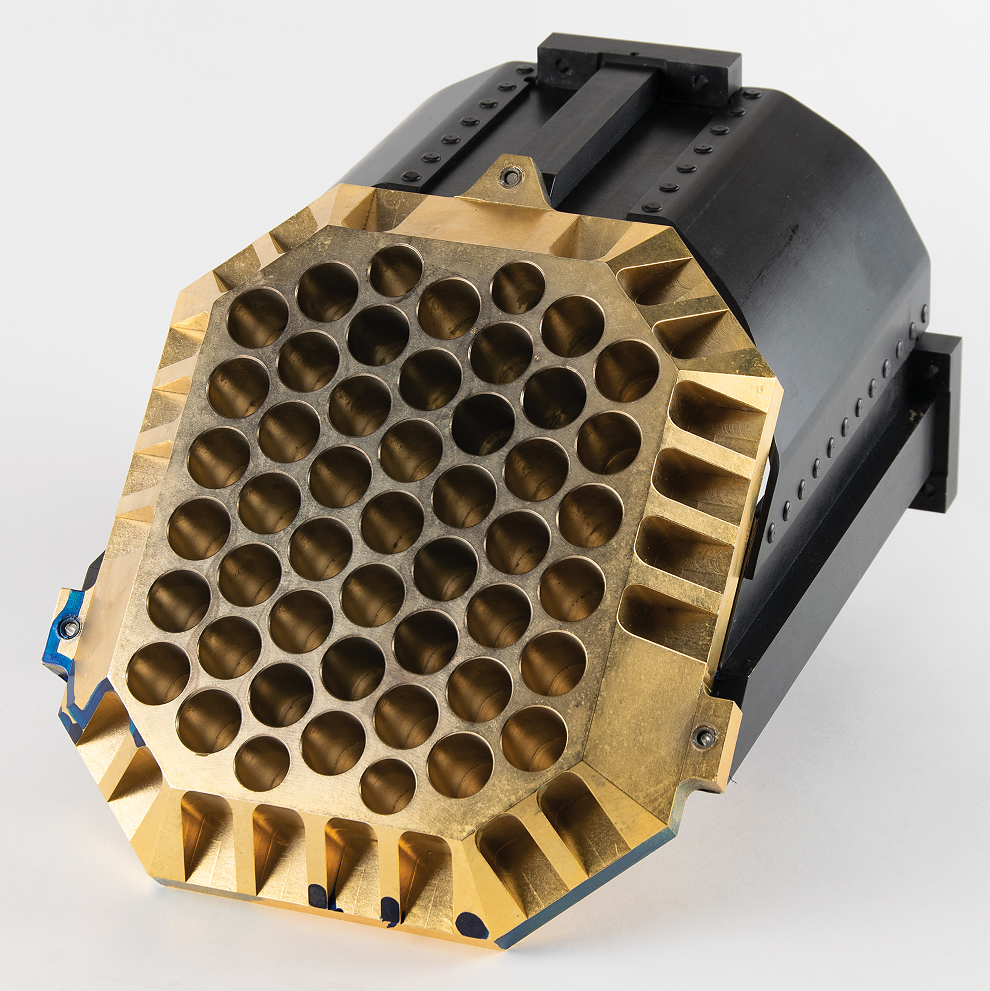 Large pickoff mirror for an undetermined weapons system or military aviation application, measuring approximately 13″ x 10″ x 9″, featuring a polished golden surface attached to a black metal mounting bracket. In very good to fine condition, with some scattered scuffs and dings.