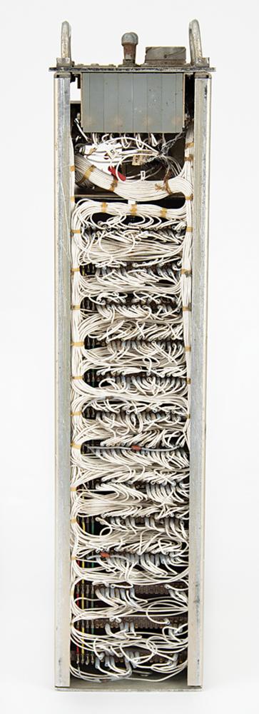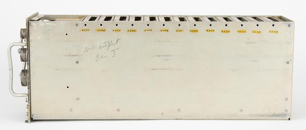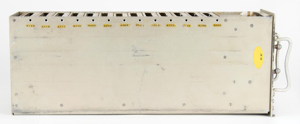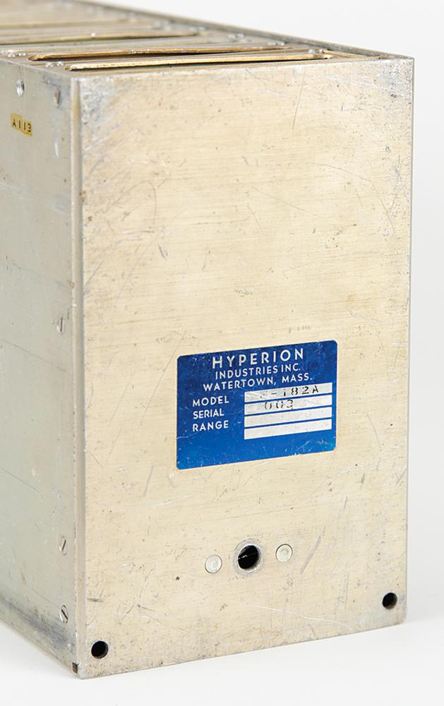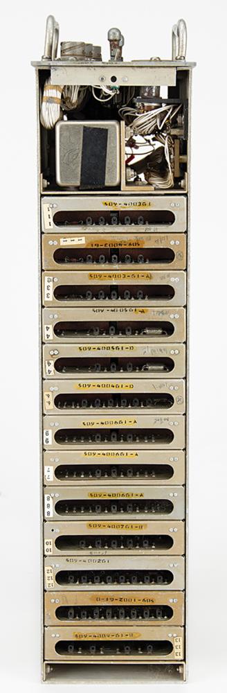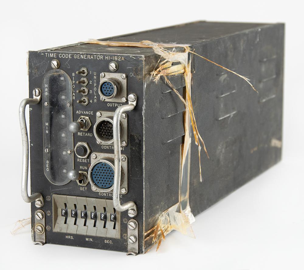 Vintage time code generator for an undetermined military aviation application, measuring approximately 5″ x 8″ x 21″, marked on the front panel: "Time Code Generator HI-182A." The control panel boasts four bipolar/unipolar toggle switches, early miniature Nixie tube numeric displays for "Hrs," "Min," and "Sec," and manual rotating time code switches. The time code generator pulls out from its housing, revealing its internal wiring and modules. This type of time code generator was used to provide a precise time code for recording on flight instrumentation recorders often used during flight testing of prototype or modified aircraft.