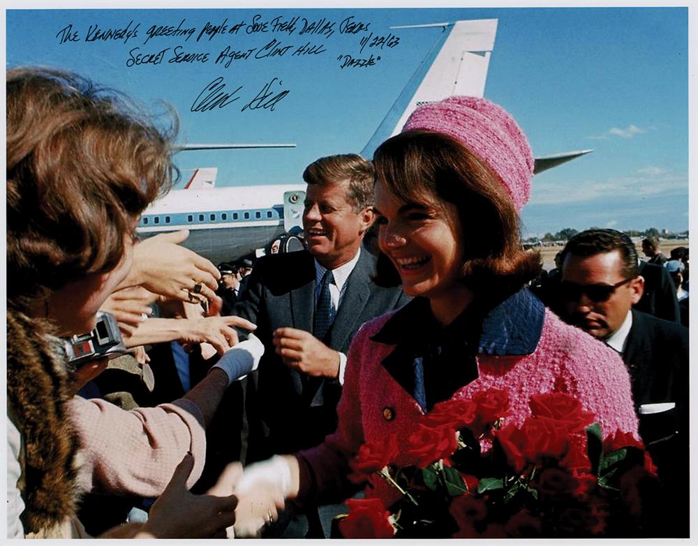 Color satin-finish 14 x 11 photo of the Kennedys upon their arrival at Love Field, Dallas, on the day of John F. Kennedy's assassination, signed in black felt tip, "The Kennedy's greeting people at Love Field, Dallas, Texas, 11/22/63, Secret Service Agent Clint Hill, 'Dazzle,' Clint Hill." In fine condition.