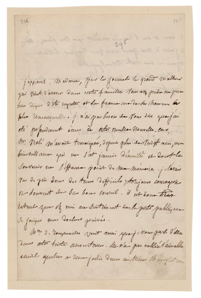 French political thinker and historian (1805-1859) best known for his works Democracy in America and The Old Regime and the Revolution. ALS in French, signed “A. de Tocqueville,” one page both sides, 5 x 8.25, November 28, 1855. Untranslated handwritten letter by Alexis de Tocqueville. In fine condition, with the blank integral sheet inlaid into a slightly larger page.