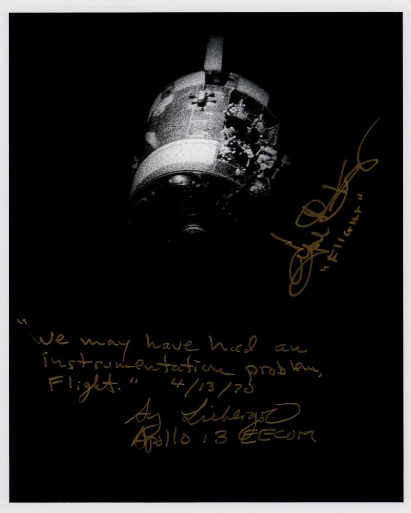 Satin-finish 8 x 10 photo of the damaged Apollo 13 capsule, signed in gold ink by two of NASA's heroic mission controllers: "Eugene F. Kranz, 'Flight,'" and "'We may have had an instrumentation problem, Flight.' 4/13/70, Sy Liebergot, Apollo 13 EECOM." In very fine condition.