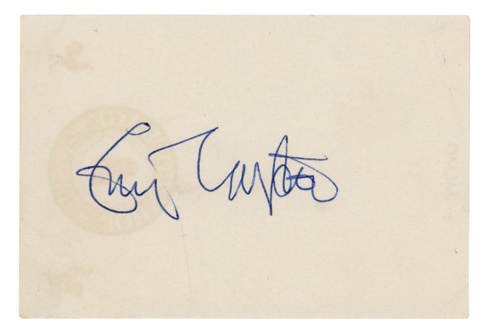 Desirable vintage circa 1960s ballpoint signature, "Eric Clapton,” on an off-white 3.75 x 2.5 slip. In very fine condition. A sought-after early, legible example of Clapton's autograph.