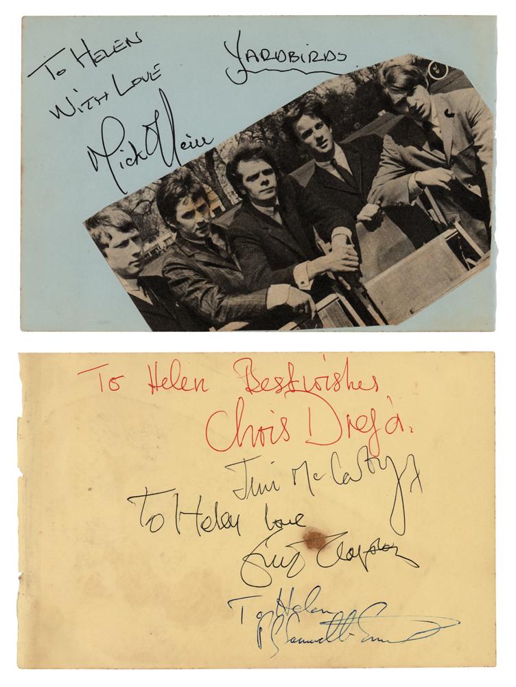 Vintage circa 1964 ballpoint signatures and inscriptions by The Yardbirds, "To Helen, Love, Eric Clapton," "To Helen, Best Wishes, Chris Dreja," "Jim McCarty," and "To Helen, P. Samwell-Smith,” on a yellow 7.25 x 4.75 album page, plus the fill-in for a sick Keith Relf, "To Helen, With Love, Mick O'Neill, Yardbirds," on a blue 7.25 x 4.75 album page. In very good to fine condition, with a stain touching Clapton's signature. Desirable early autographs from a short-lived Yardbirds lineup.