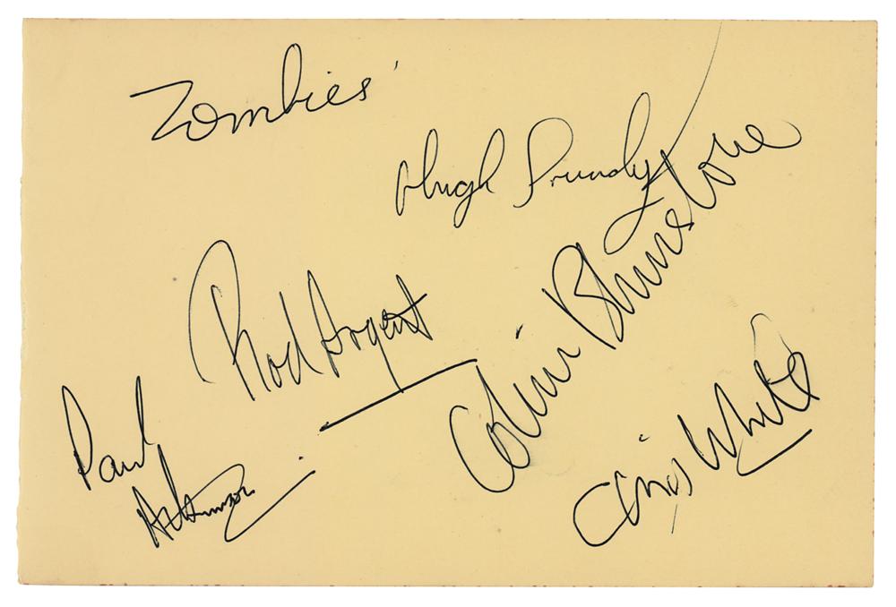Vintage circa 1960s ballpoint signatures of The Zombies—Paul Atkinson, Colin Blunstone, Rod Argent, Hugh Grundy, and Chris White—on a light yellow 7.25 x 4.75 album page. In fine condition.