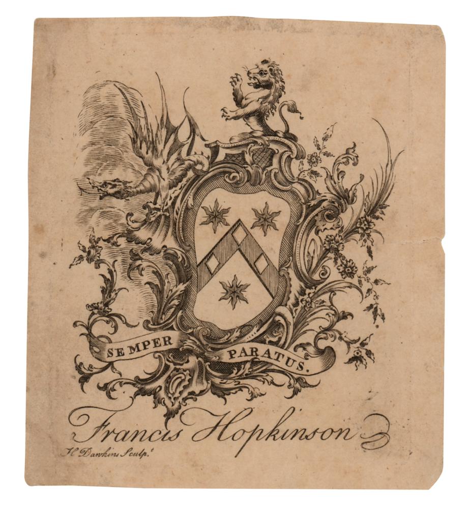 Desirable late 18th-century personalized bookplate for New Jersey Declaration signer Francis Hopkinson, 3.5 x 4, engraved by Henry Dawkins of New York, featuring Hopkinson's "Semper Paratus" coat of arms, with his name imprinted below. In fine condition.