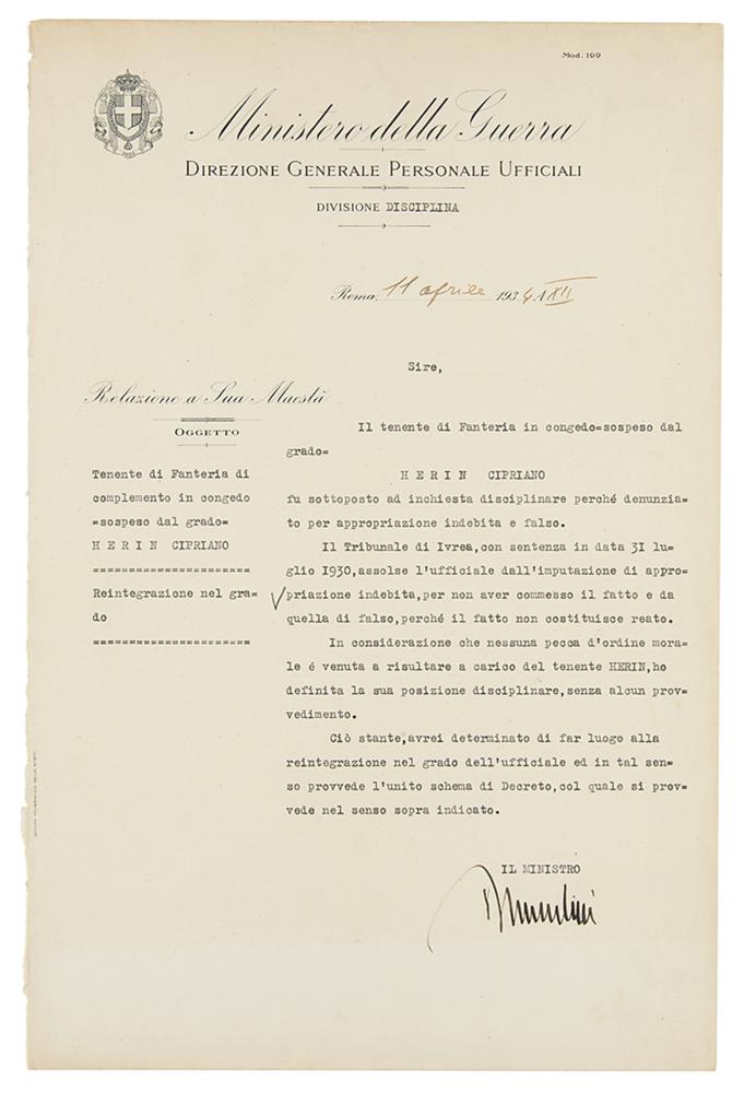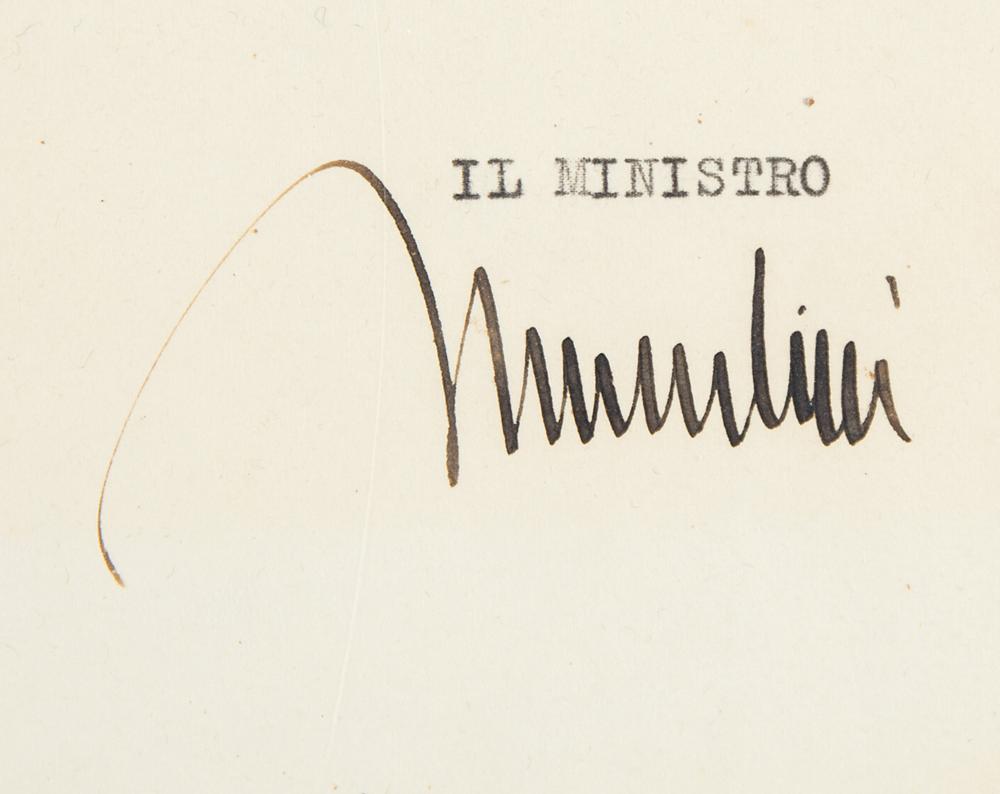DS in Italian, signed “Mussolini,” one page, 9.5 x 14.5, April 11, 1934. Ministry of War document concerning the reinstatement of an officer charged with embezzlement and forgery, boldly signed at the conclusion by Benito Mussolini. In fine condition.