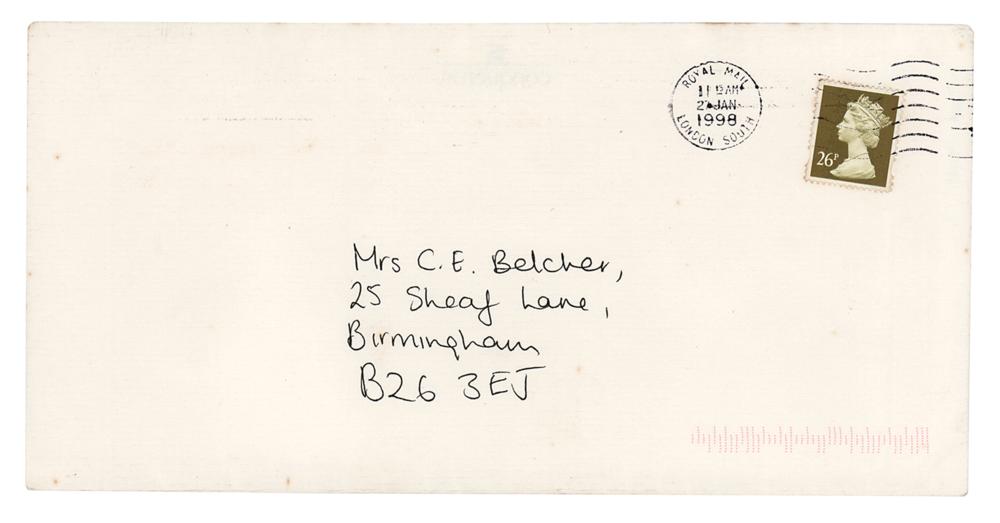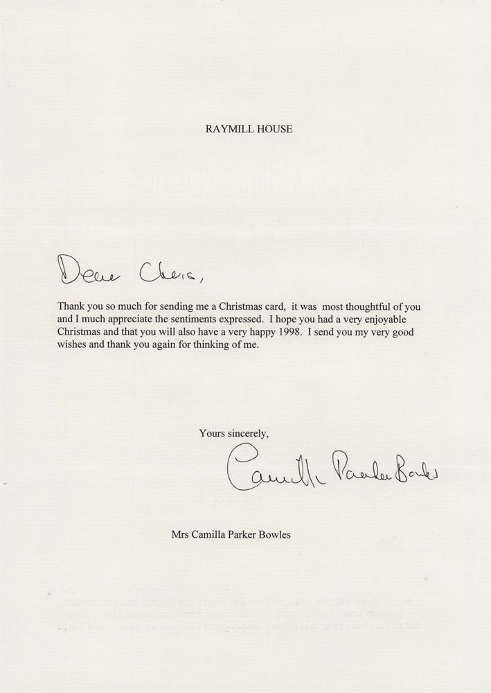 TLS signed “Camilla Parker-Bowles,” one page, 8.25 x 11.75, Raymill House letterhead, no date but postmarked January 27, 1998. Letter to Mrs. C. E. Belcher, in part: "Thank you so much for sending me a Christmas card, it was most thoughtful of you and I much appreciate the sentiments expressed. I hope you had a very enjoyable Christmas and that you will also have a very happy 1998." In fine condition. Accompanied by the original mailing envelope.