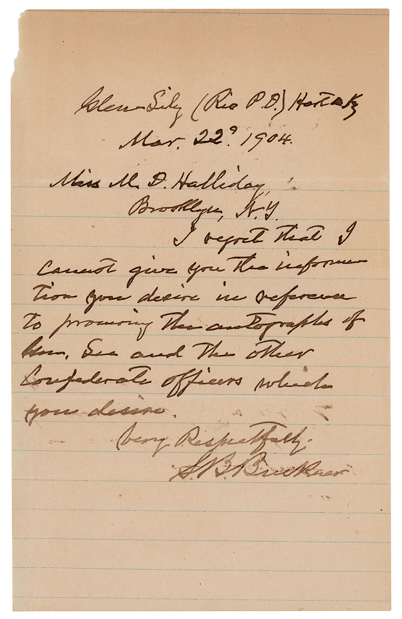 Confederate general (1823-1914) best remembered for submitting to Grant's famous demand for unconditional surrender at the Battle of Fort Donelson. ALS signed “S. B. Buckner,” one page, 5 x 8, March 22, 1904. Handwritten letter to Miss M. D. Halliday, in full: “I regret that I cannot give the information you desire in reference to promising the autographs of Gen. Lee and the other Confederate officers which you desire.” In fine condition.