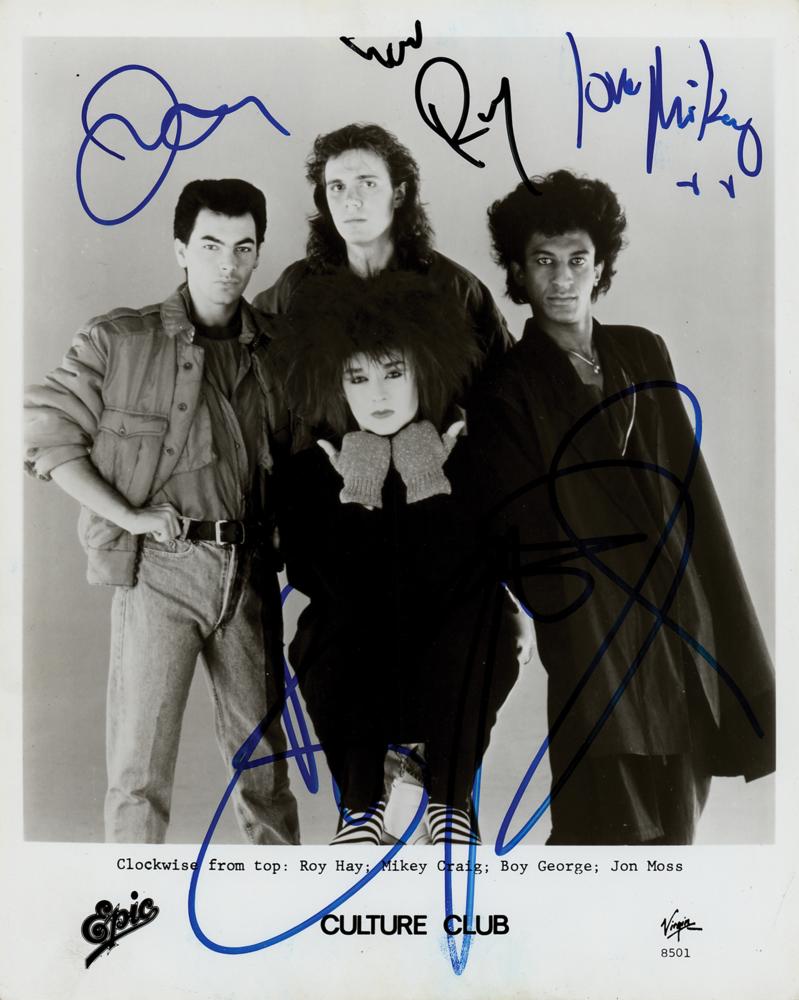 Glossy 8 x 10 Epic Records promo photo of Culture Club, signed in felt tip by Boy George, Roy Hay, Mikey Craig, and Jon Moss. In fine condition, with a minor smudge to the bottom of Boy George's signature. Accompanied by a Culture Club tour pass, stamped "Guest."