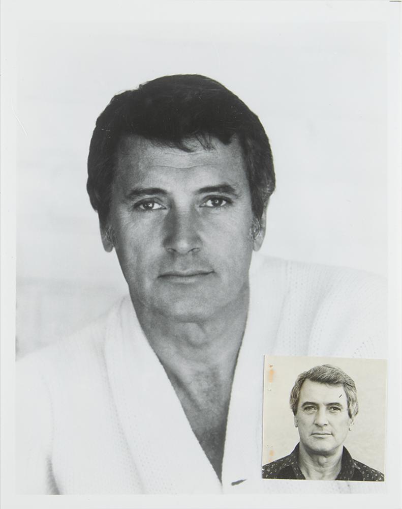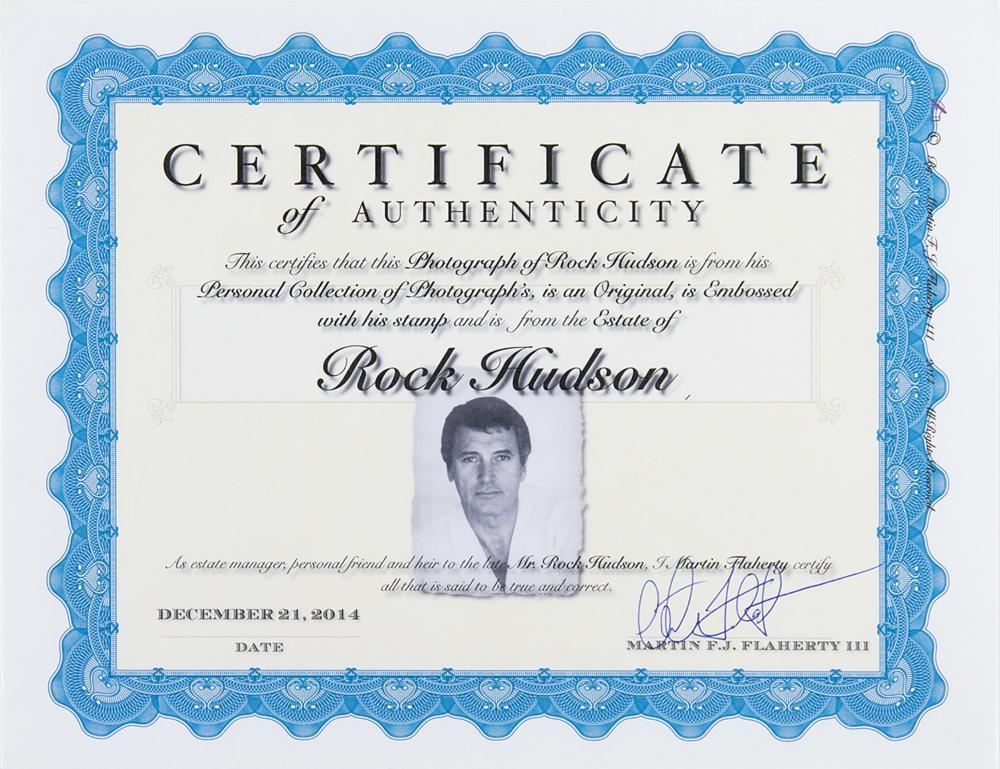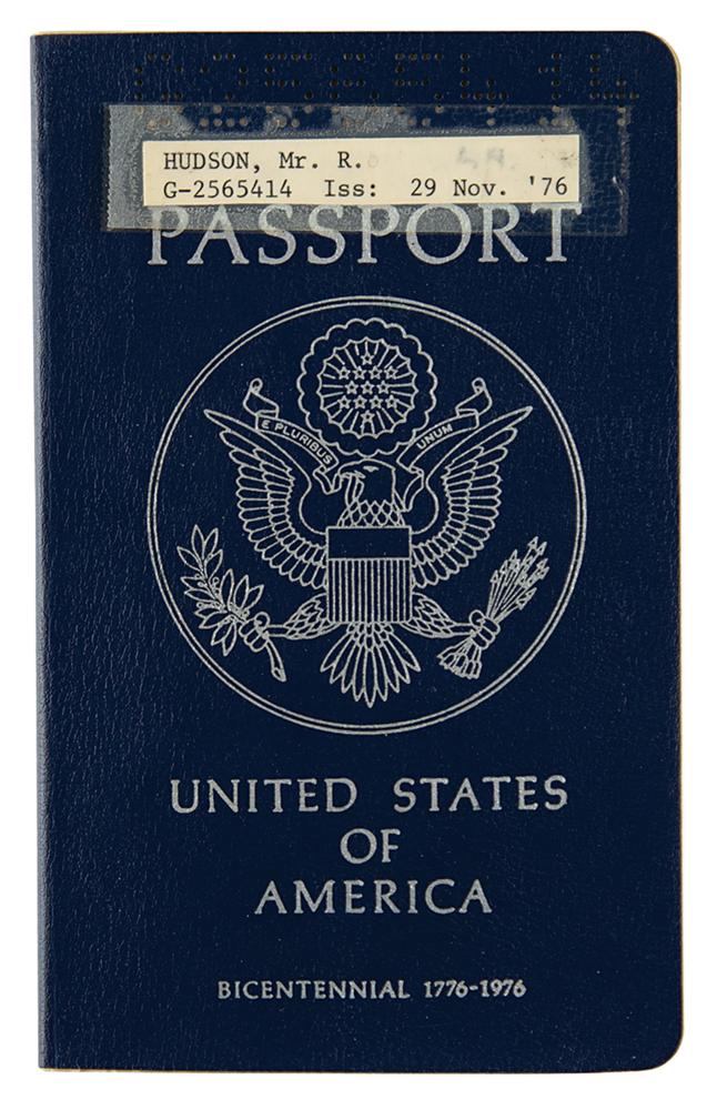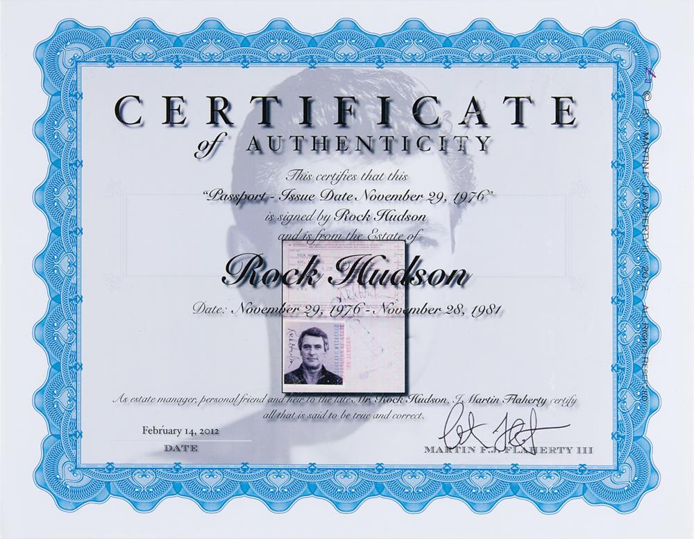 Rock Hudson’s personal United States of America passport, number G2565414, issued on November 29, 1976. Passport measures 3.75 x 6 and is filled out in ballpoint by Hudson on the inside front cover with his address, "9422 Beverly Crest, Beverly Hills, 90210." His description page is filled out in type with his name, birth date, height, birthplace, and hair and eye color, with Hudson signing below, “Rock Hudson.” Affixed to the adjacent page is his 3 x 3.25 passport photo, signed in black ink, "Rock Hudson." The passport includes several visa stamps for Mexico, China, Morocco, Portugal, England, Spain, Japan, and Liechtenstein, all dating to 1977 and 1978. Also present is an extra 2.5 x 2.5 passport photo of Hudson, as well as a glossy 8 x 10 promotional photo of the actor. In fine condition. Accompanied by certificates of authenticity from Hudson’s estate manager, friend, and heir, Martin Flaherty, who attests that both the passport and the promotional photo derive from the estate of Rock Hudson.