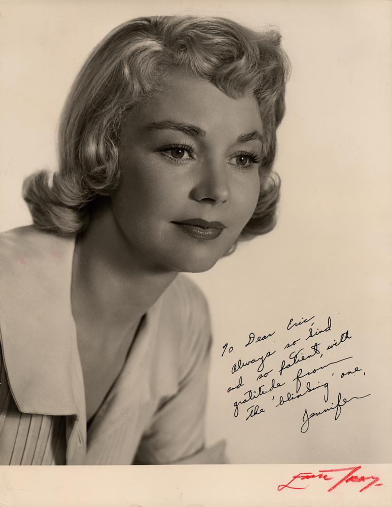 Uncommon vintage matte-finish 11.25 x 14.5 promotional portrait photo of Jennifer Jones for the 1953 John Huston film Beat the Devil, signed and inscribed in fountain pen to Eric Gray, the film's still photographer, "To Dear Eric, Always so kind and so patient, with gratitude from, the 'blinking' one, Jennifer.” The lower border is signed in red pencil by the photographer. In fine condition, with some trivial corner creasing. A very desirable signed portrait of the lovely leading lady; Jones remains quite rare in autographed photos, especially in examples of such large size.