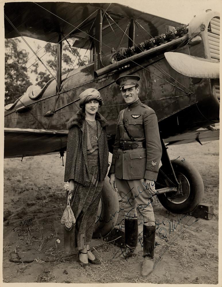 Vintage glossy 10.5 x 13.75 photo of Anna Q. Nilsson standing with a Medical Officer of the 115th Airlift Squadron in front of a Douglas World Cruiser at Clover Field in Santa Monica, California, near the tail-end of the first aerial circumnavigation of the world, which was completed in 1924 by four aviators from an eight-man team of the United States Army Air Service. Signed and inscribed in fountain pen, "To Clover Field Aviators, With the best regards of ?The Bride,? Anna Q. Nilsson.? Reverse bears a J. C. Milligan credit stamp. In fine condition.