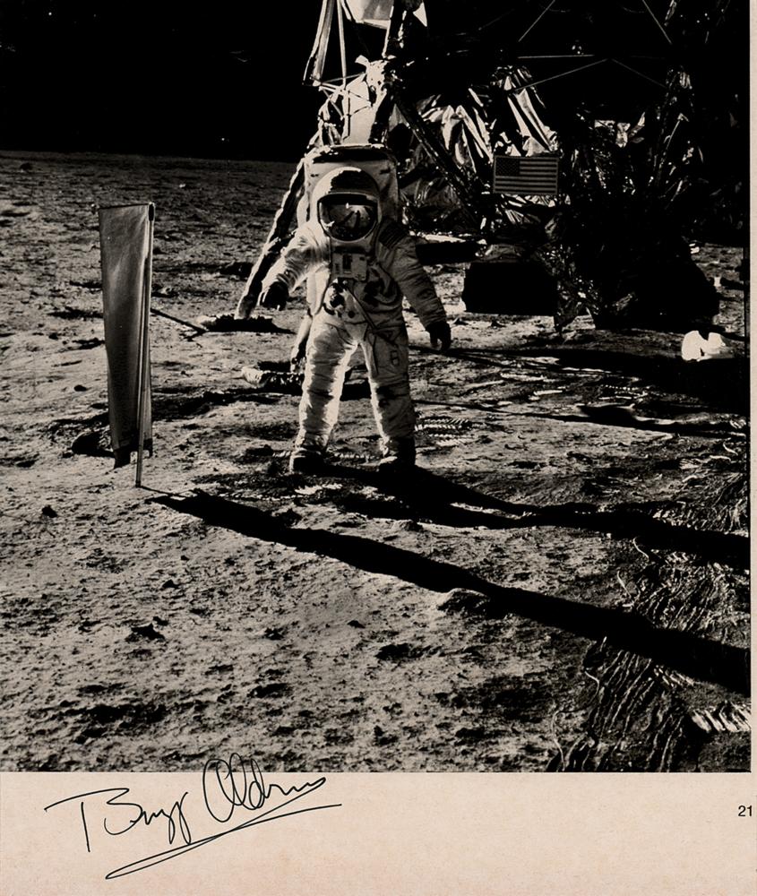Historic 8.25 x 10 magazine photo of Aldrin on the lunar surface after deploying the Solar Wind Composition Experiment (SWC) during Apollo 11, signed in the lower border in black felt tip, "Buzz Aldrin." In fine condition, with trimmed edges.